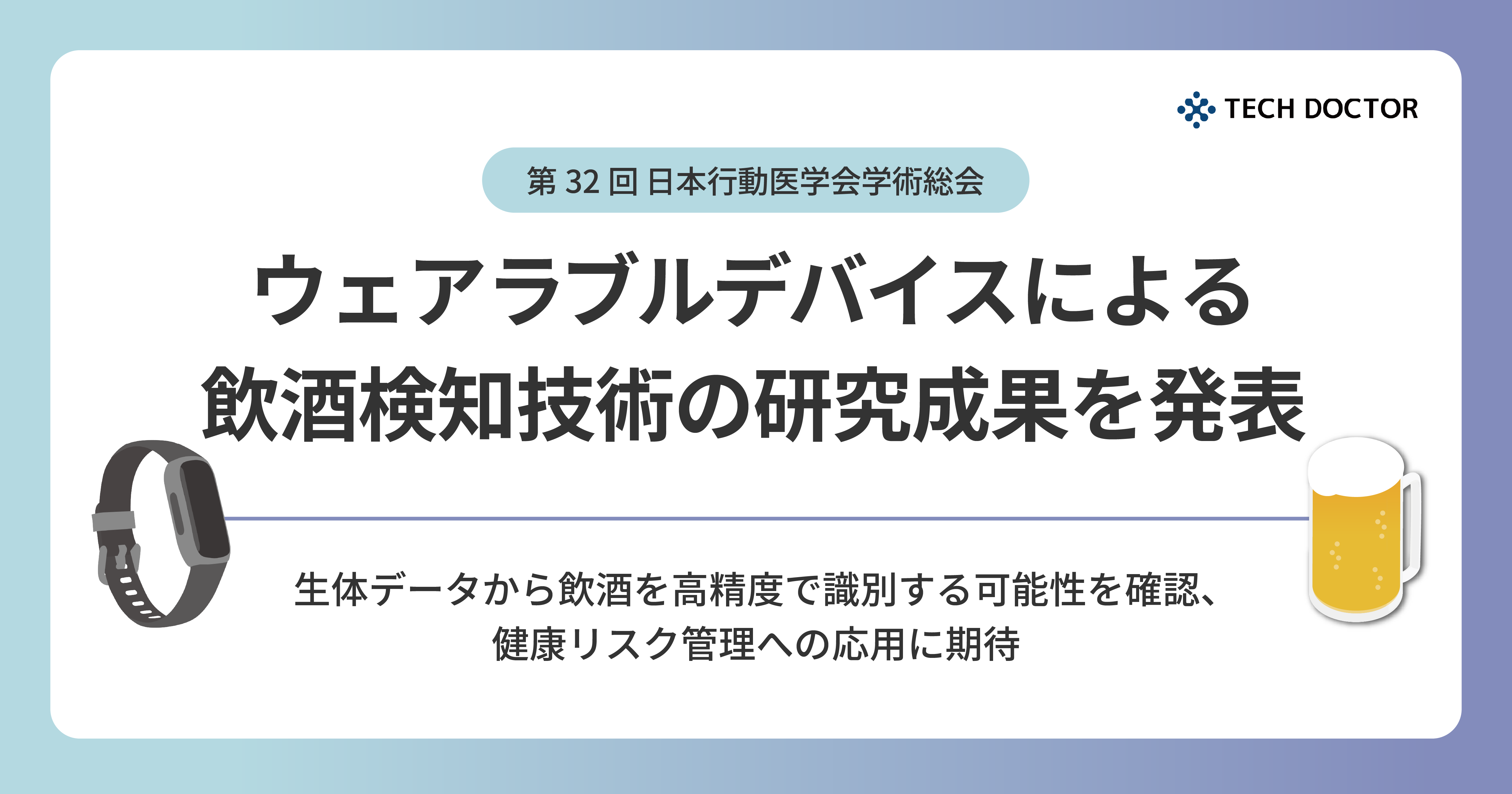 第32回 日本行動医学会学術総会にて ウェアラブルデバイスによる飲酒検知技術の研究成果を発表 - 生体データから飲酒を高精度で識別する可能性を確認、 健康リスク管理への応用に期待 - 投稿日:2025.12.09 投稿者:株式会社テックドクター