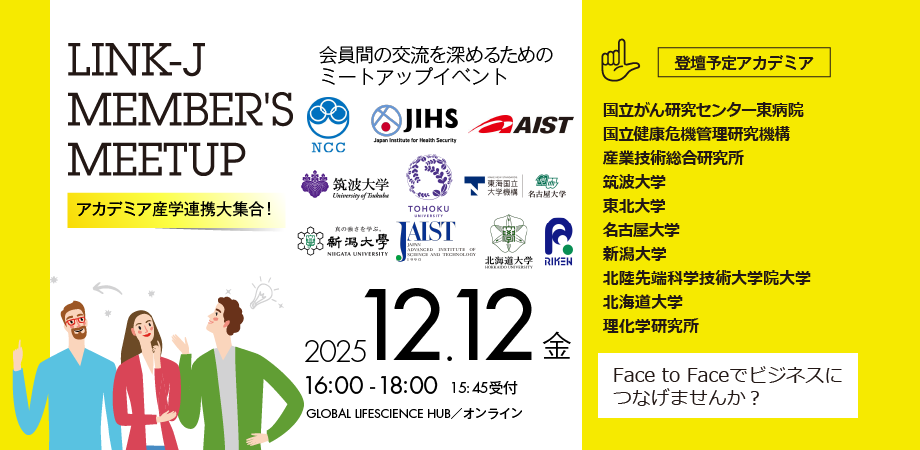 毎回テーマ(2025年年間予定のお知らせ:ミートアップイベント『LINK-J Member's Meetup』 | ニュース | LINK-J)を設けて開催しており、今回は「アカデミア産学連携大集合!」です。大学紹介、産学連携やスタートアップ支援等の取り組みのプレゼンテーション後、リアル会場のみネットワーキングタイムのお時間も設けておりますので、ぜひLINK-J会員同士の交流を深めていただければと思います。